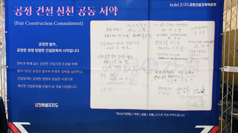 박람회장 내 대형 서약 보드에는 ▲발주기관의 공정한 발주 및 투명한 감독 ▲건설업계의 공정 경쟁과 성실 시공 ▲청탁·특혜 없는 건설환경 조성을 공동으로 다짐하는 내용이 담겼으며, 행사 기간 동안 전시장에 비치되어 참가자와 업체들의 자발적인 릴레이 서명이 이어지고 있다.