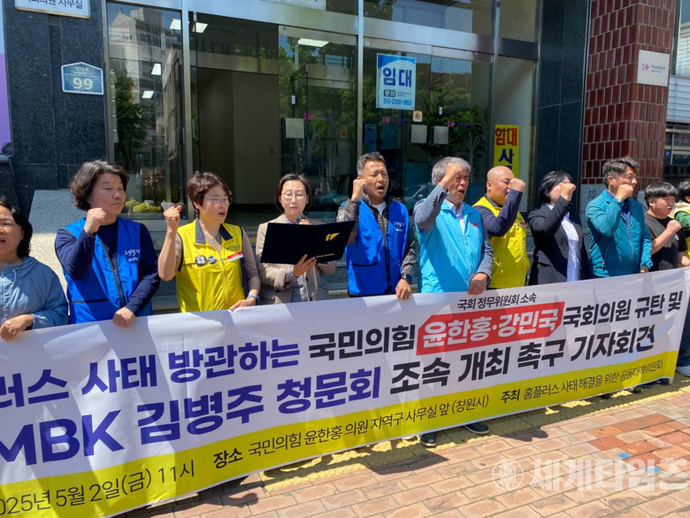 [세계타임즈 = 이판석 기자] 경남 지역의 홈플러스 노동자들이 2일, 김병주 MBK 파트너스 회장을 증인으로 하는 국회 청문회 개최를 요구했다.