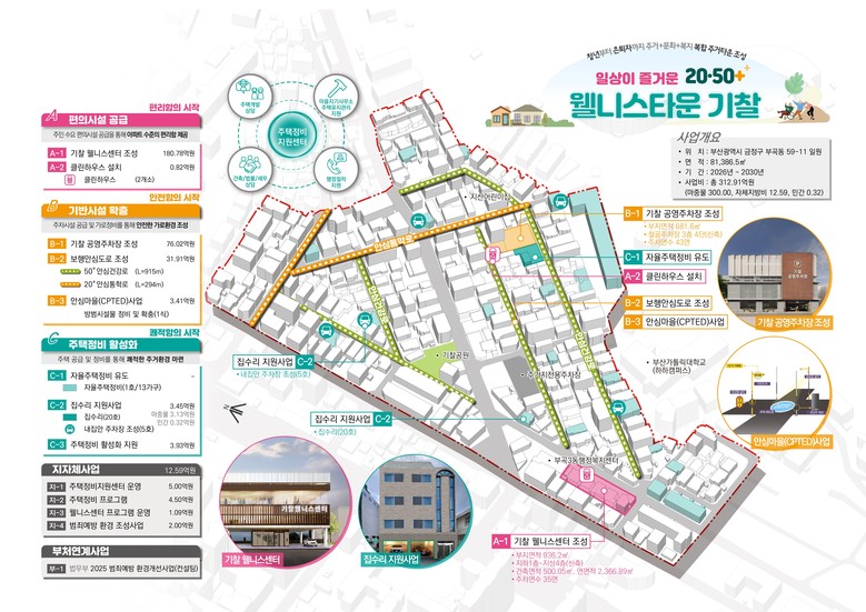 금정구 부곡3동 ‘일상이 즐거운 20·50플러스(+) 웰니스타운 기찰’은 주민 수요 맞춤형 편의시설을 공급하고 주차장과 가로환경을 정비해 정주환경을 개선하고 지역 주민의 신규 주택 정비를 유도하는 사업이다.