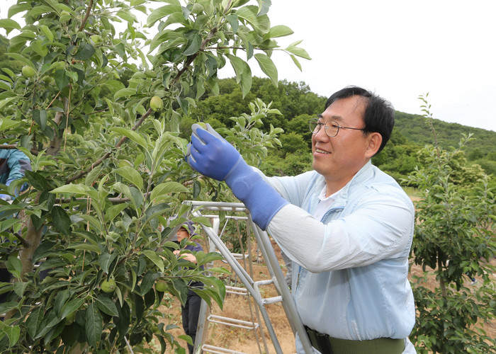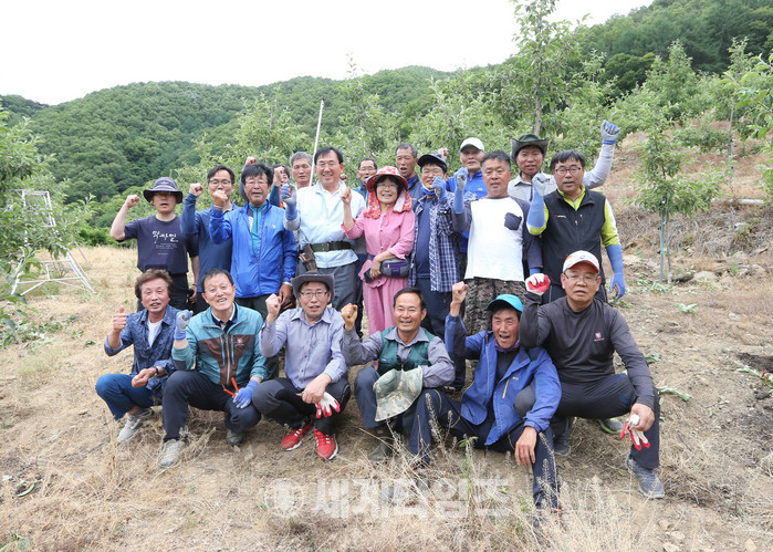 나 군수는 연풍에 사는 박씨의 친구 10여명이 사과 농사를 돕고 있지만 일손이 부족해 사과 적과가 늦어지고 있는 것을 안타까워한다는 이야기를 듣고 6일 오후 박씨의 농가를 방문한 것이다.