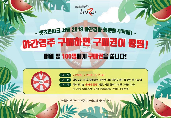 ‘올빼미 구매권 이벤트’는 저녁 8시부터 출발 경주에 렛츠런파크 서울에서 5만 원 이상 마권을 구매한 사람 중 랜덤으로 100명을 추첨하여 행운의 룰렛을 돌릴 수 있는 응모권을 준다. 행운의 룰렛은 100% 확률로 당첨되며 구매권 5만 원을 30명에게, 구매권 3만 원을 20명에게, 구매권 1만 원을 50명에게 증정한다.