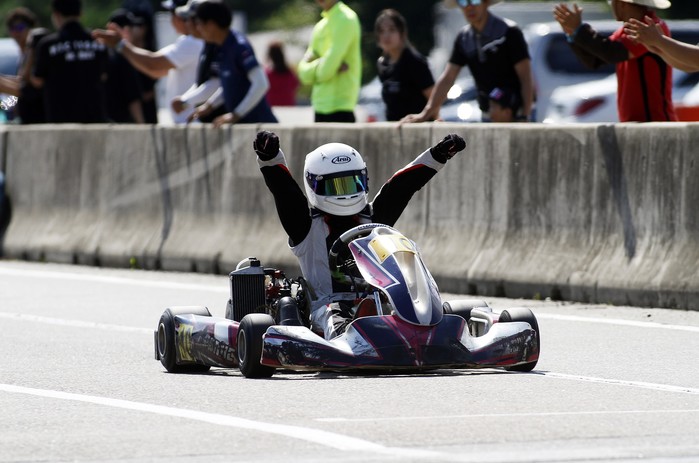 [사진설명] 강승영이 25일 파주 스피드파크에서 열린 2019 카트 챔피언십 5라운드 선수부 레이스에서 가장 먼저 체커기를 받으며 두 팔을 번쩍 치켜들고 있다.