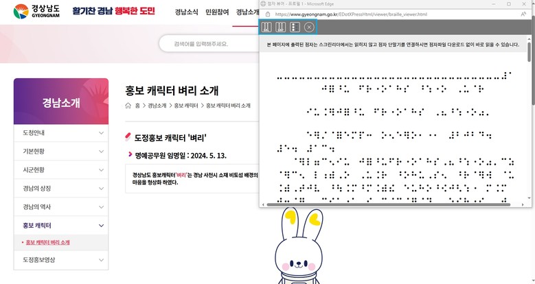 - 첨부파일 음성안내 서비스도 제공해 시각장애인의 정보 접근성 강화 [세계타임즈=경남 최성룡 기자] 경상남도(도지사 박완수)는 제46회 장애인의 날(4월 20일)을 맞아, 시각장애인의 정보 접근성을 높이고 누구나 차별 없이 이용할 수 있는 누리집 환경을 만들기 위해 도 누리집에 ‘전자점자 서비스’를 제공한다.