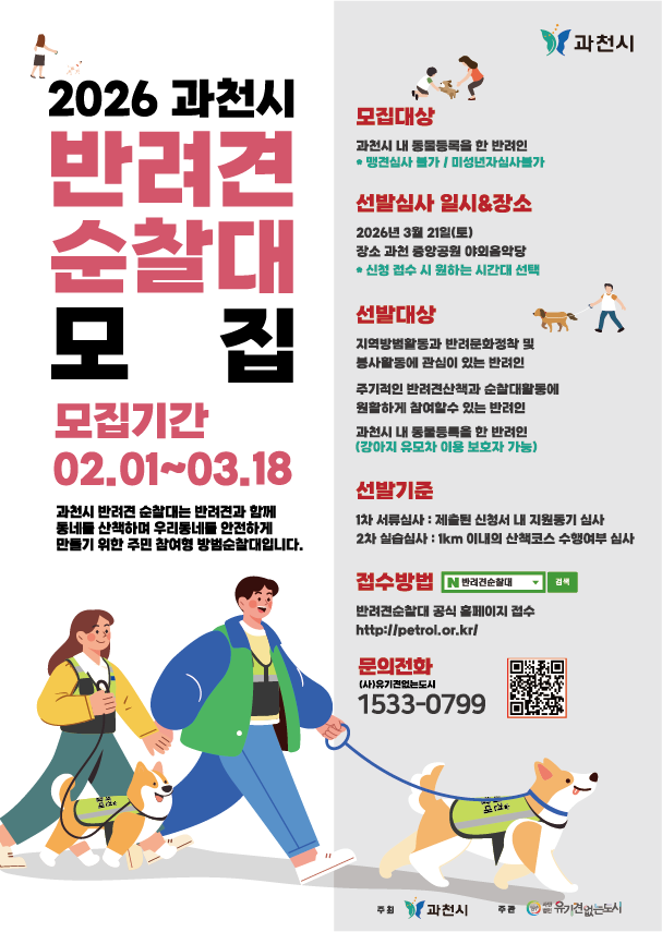 신계용 과천시장은 “반려견 순찰대는 주민이 주도적으로 우리 동네의 안전을 지키는 뜻깊은 활동”이라며, “반려견과 함께 산책도 즐기고 지역 사회에 봉사할 수 있는 이번 모집에 시민 여러분의 많은 관심과 참여를 부탁드린다”라고 전했다.
