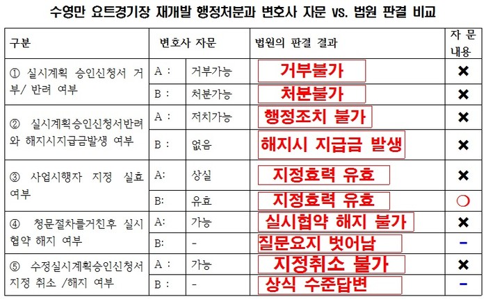 사업시행자 지정 취소 행정처분(2016. 8. 10.)의 근거가 변호사 2명으로 자문, 부산연구원의 검토보고서에 기초한다. 변호사 2명으로부터 받은 자문 5개 질의에 대한 10개의 자문결과와 법원의 판결문을 비교하면 겨우 1개 정도 일치하고, 2개의 자문은 상식적 수준이거나 질의취지에 벗어나는 답변이었다.