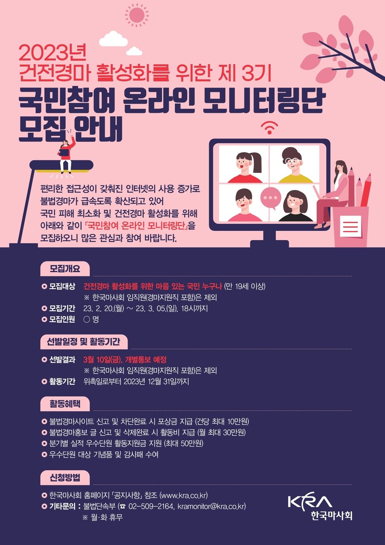 건전한 경마문화 조성에 관심 있는 19세 이상의 대한민국 국민이라면 누구나 ’제3기 국민참여 모니터링단‘ 지원이 가능하다. 모집기간은 2월 20일(월)부터 3월 5일(일) 18시까지며 한국마사회 홈페이지를 통해 지원서를 제출하면 된다.