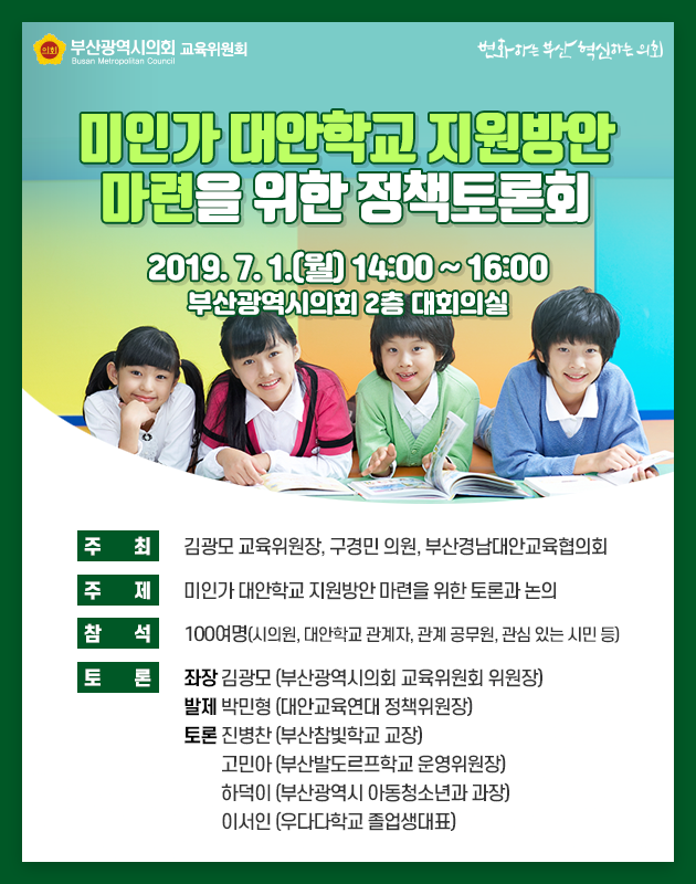 부산시의회는 7월 1일 대회의실에서 ‘평등한 교육권 보장을 위한 미인가 대안학교 지원방안 정책토론회’ 를 개최한다.