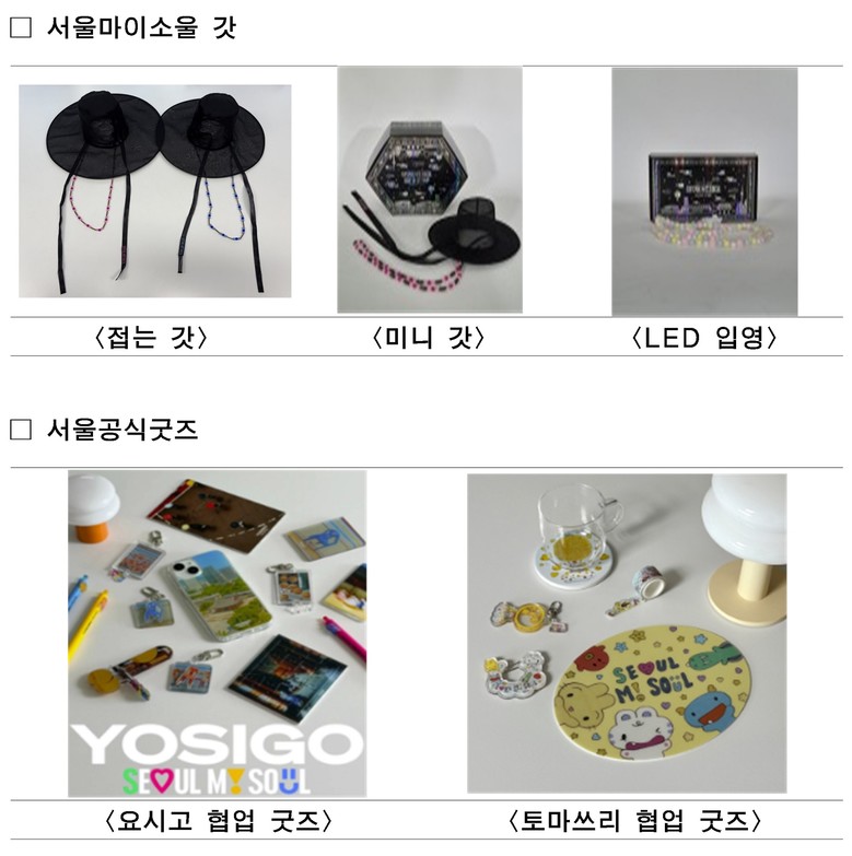 전통 패션 아이템인 ‘서울마이소울 갓’은 최근 케이팝 데몬 헌터스의 흥행으로 전통 소품인 ‘갓’이 국내.외에서 주목받음에 따라 모자 제조 전문기업인 ‘루이엘’과 협업하여 이를 서울굿즈로 개발한 것으로, 전통 요소를 현대적 라이프스타일에 맞게 재해석함으로써 서울브랜드의 확장 가능성을 새로운 방식으로 제시했다.