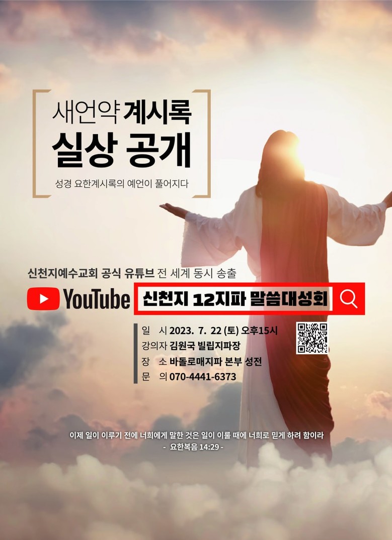 이에 신천지예수교회는 전국적인 요청과 문의를 받아들여 오는 22일 ▲서울특별시 영등포구 ▲서울 종로구 ▲경기도 수원시 ▲경기도 고양시 ▲인천광역시 연수구 ▲대전광역시 서구 ▲광주광역시 북구 ▲부산광역시 사하구 ▲부산광역시 동구 ▲대구광역시 달서구 ▲강원도 춘천시 ▲전라북도 전주시 등 전국 12지역에서 말씀대성회를 연다. 강연 주제는 ‘새 언약 계시록 실상 공개’이며, 신천지예수교회 12지파의 지파장이 강연자로 나선다.