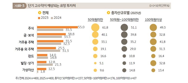 2024년 같은 조사 결과와 비교해 유동성 금융자산과 예·적금, 주식의 비중이 각 0.4%포인트(p), 1.0%p, 0.5%p 늘었다. 반대로 거주용 주택, 거주용 외 주택, 빌딩·상가는 각 1.0%p, 0.5%p, 1.6%p 줄었다. 부동산 시장 관망세와 부동산 신규 투자 위축 때문이라는 게 연구소의 설명이다.