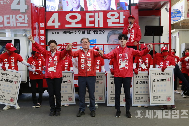 [세계타임즈 = 이진화 기자] 6.1지방선거 마지막날인 31일 오후 부림면 신반전통시장에서 재선에 도전하는 무소속 오태완 경남 의령군수 후보와 배우자인 배민주 여사, 아들이 유권자들에게 지지를 호소하고 있다.