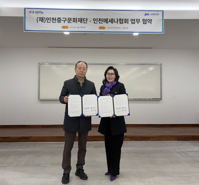 [중구 세계타임즈=심하린 기자] (재)인천중구문화재단(이사장 김정헌)은 지역 문화예술 발전을 위해 인천메세나협회(대표 봄날이상연)와 업무협약(MOU)을 체결했다고 6일 밝혔다.