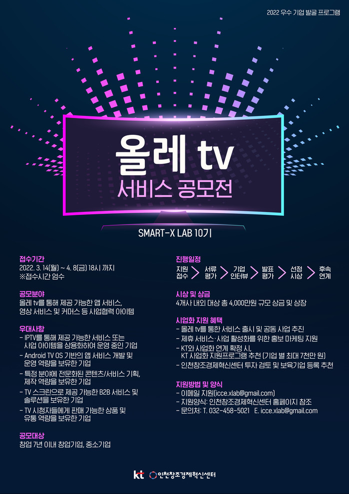[세계타임즈 이영진 기자]KT는 인천창조경제혁신센터와 함께 미디어 서비스 우수 기업 발굴과 IPTV 기반 특화 서비스 확대를 위한 ‘올레 tv 서비스 공모전’을 진행한다고 14일 밝혔다.
