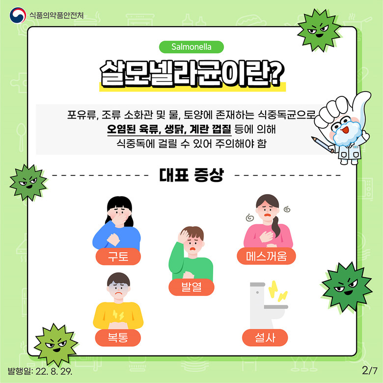 물과 토양, 가금류·포유류의 소화관에 존재하는 살모넬라균은 오염된 식품 섭취 시 발열, 복통, 구토, 설사 등의 식중독 증상을 유발하므로, 달걀, 알가공품 등 식재료의 위생적 취급과 보관이 중요하다.