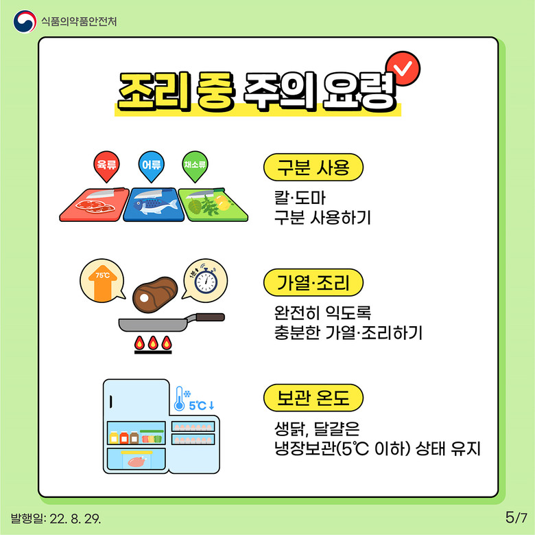 살모넬라는 열에 약하므로 육류·달걀 등은 중심온도 75℃에서 1분 이상 가열하는 것이 안전하다.