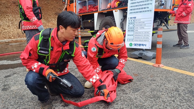 이번 합동 훈련에서는 고성능 산불 진화차의 제원과 성능에 대한 설명을 시작으로 출동 상황에서의 대전시와 자치구 역할 분담, 자치구 지원 급수차와 진화 인력의 호스 전개 및 담수 지원 등 실제 산불 상황을 가정한 훈련이 진행됐다.