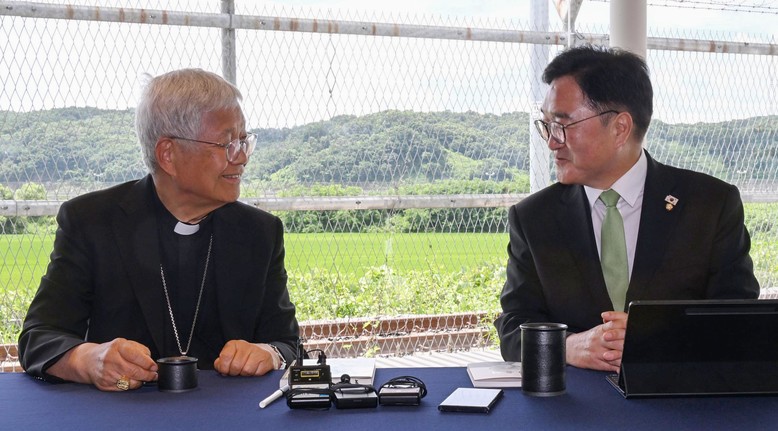 유흥식 추기경과 우원식 국회의장이 23일 경기 파주 임진각 평화누리공원 일원에서 만나 한반도 평화와 남북교류 복원을 위한 평화 대담을 나누고 있다. 2025.7.23 [국회사진기자단]