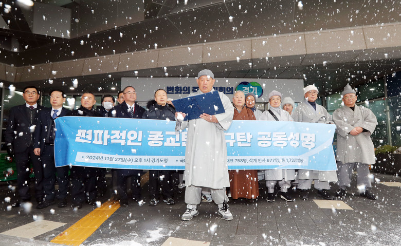 27일 오후 경기도 수원시 경기도청 앞에서 종교지도자 등 오피니언 리더들이 경기도와 경기관광공사의 편파적인 종교탄압에 대한 공동 항의성명문을 용현스님이 대표로 낭독하고 있다.