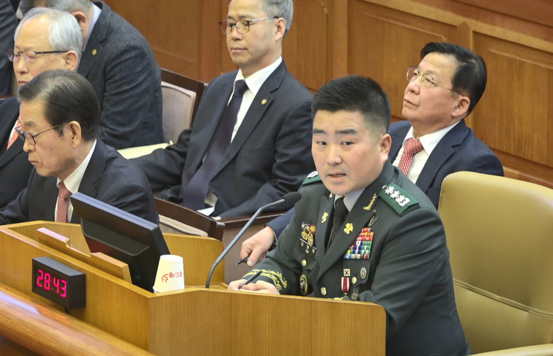 김현태 육군 특수전사령부 707특수임무단장이 6일 서울 종로구 헌법재판소에서 열린 윤석열 대통령 탄핵 심판 6차 변론에 증인으로 출석해 답변하고 있다. 2025.2.6 [헌법재판소 제공]
