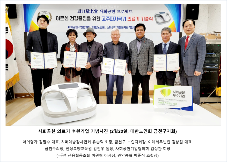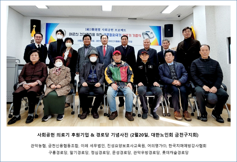 이날 행사는 대한노인회 금천구지회에서 1사 1경로당 사회공헌 프로젝트 '어르신 건강증진 고주파자극기 의료기 기증식'을 2월 20일 진행되었다.