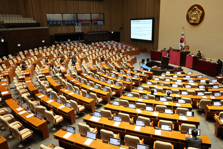 국민의힘 김장겸 의원이 5일 국회 본회의에서 여야 의원석이 대부분 비어 있는 가운데 방송문화진흥회법 일부개정법률안에 대한 필리버스터(무제한 토론을 통한 합법적인 의사진행 방해)를 3시간이 넘게 하고 있다. 2025.8.5