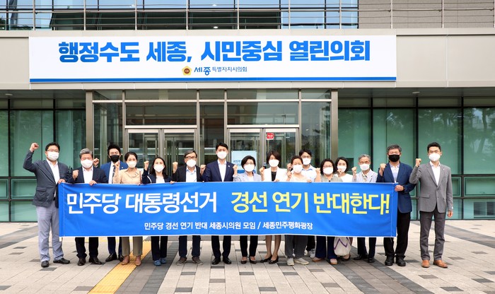 “민주당 대통령 선거 경선 연기 반대 세종시의원 모임(이하 시의원모임)”과 “세종민주평화광장”은 6월 15일 오후 1시 30분 세종시의회 앞에서 집회를 개최하고 경선 연기에 대한 반대입장을 밝혔다.