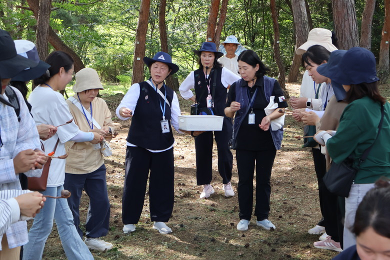 교육은 내포 사색길 입구에서 가벼운 체조로 몸과 마음을 열며 시작되었다. 이어 참가자들은 코스를 나누어 소그룹 활동을 진행하며 숲 속 식물과 자연물에 대해 배우고, 이를 활용한 다양한 오감 놀이 방법을 탐색하였다.