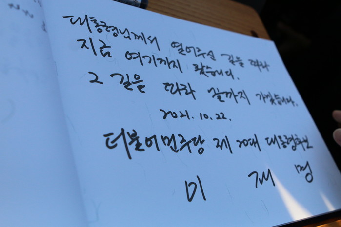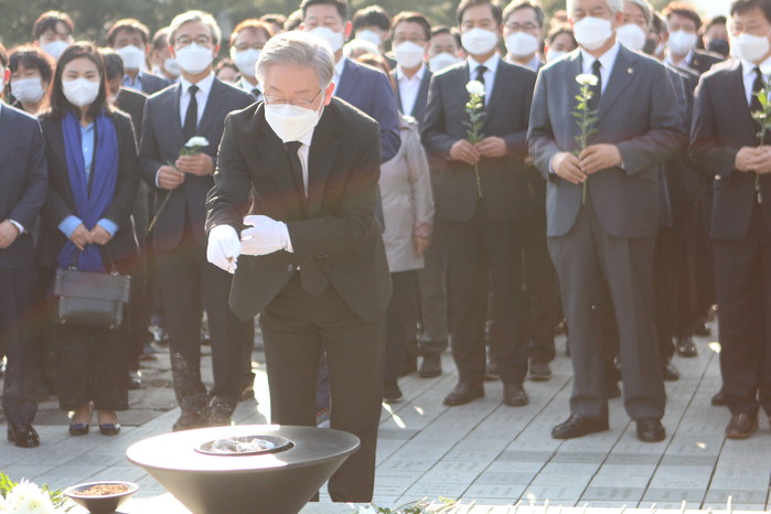 이날 참배에는 이 후보를 비롯해 박홍근 후보 비서실장, 박찬대 수석대변인, 김남국 수행실장과 민형배 의원, 전재수·이상헌·김정호 의원 등 PK(부울경) 의원들이 함께했다. 노 전 대통령의 사위 곽상언 변호사도 자리했다.