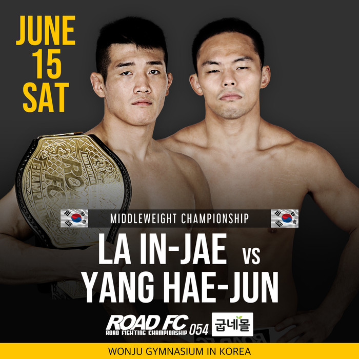 [세계타임즈 김인수기자] ROAD FC (로드FC)가 6월 15일 원주 종합체육관에서 개최하는 굽네몰 ROAD FC 054의 대진을 추가로 확정지었다. 지난 8일 발표한 ‘미들급 챔피언’ 라인재(33, 팀 코리아MMA)와 양해준(31, 팀파시)의 타이틀전, ‘더 솔로’ 유재남(32, 로드짐 원주 MMA)과 김태균(30, 팀 피니쉬)의 밴텀급 대결에 이은 대진 발표다.