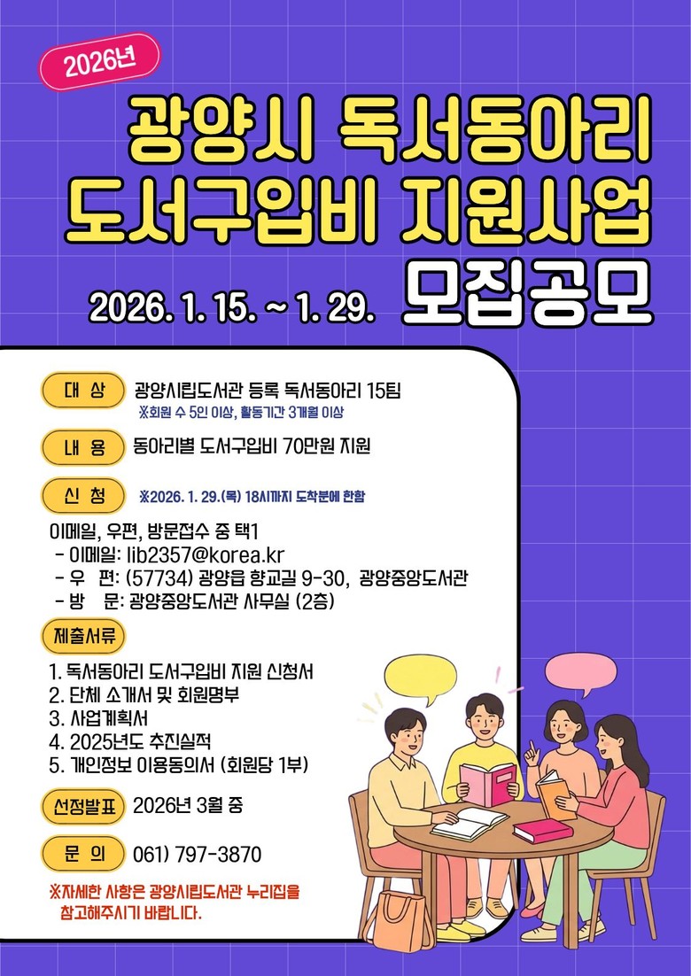 기타 자세한 사항은 광양시 도서관과 도서관지원팀(☎061-797-3870)으로 문의하면 된다.