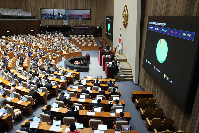 23일 국회 본회의에서 윤석열 정부 당시 재의요구권(거부권) 행사로 폐기됐던 '농업 4법' 가운데 농어업재해대책법 개정안이 통과되고 있다. 2025.7.23