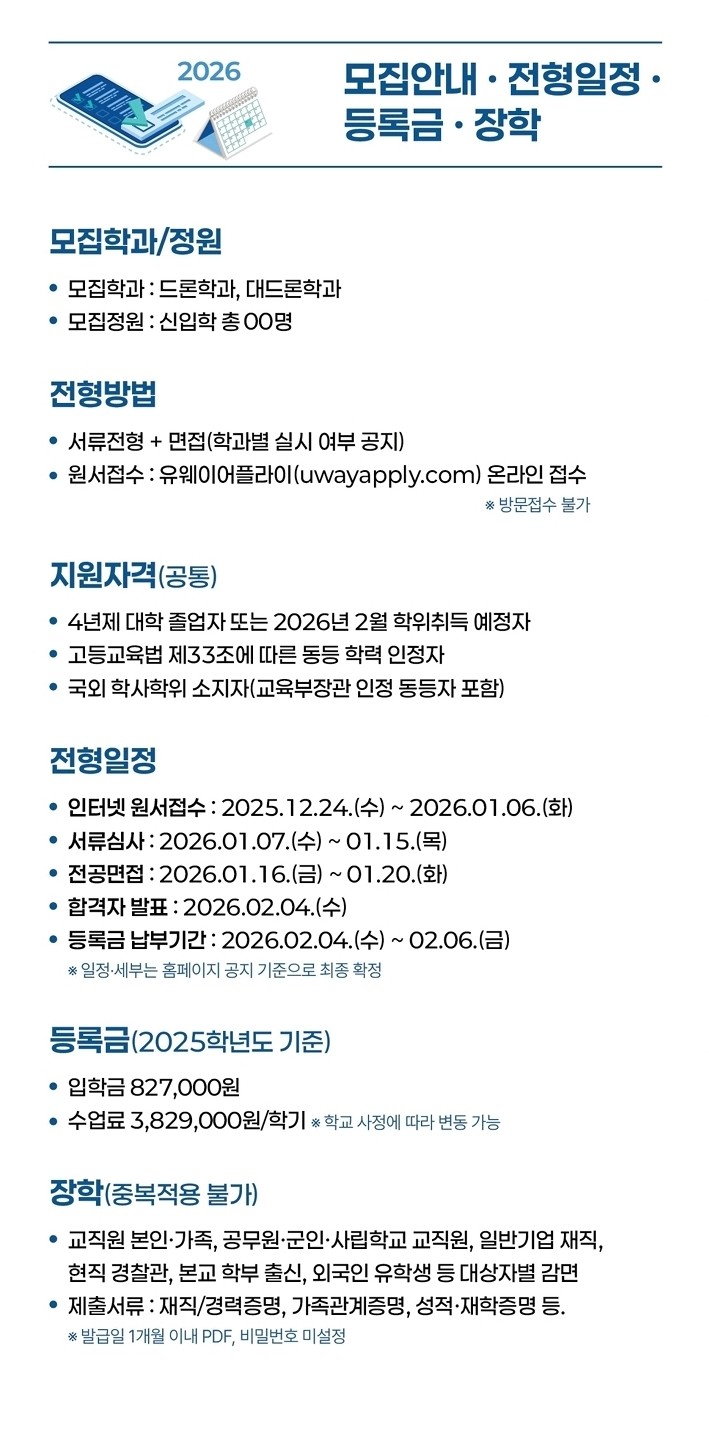 드론시큐리티융합대학원은 2026학년도 1학기부터 드론학과 및 대드론학과 석사과정(정원 40명) 신입생을 모집한다. 수업은 주중 야간 및 주말 집중형으로 운영되며, 재직자·공무원·산업체 전문가를 대상으로 한 맞춤형 실무 중심 교육체계가 특징이다.