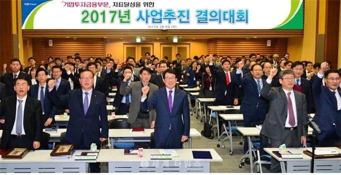 [세계타임즈 김장수 기자] NH농협은행은 9일 중구 통일로 본점 대회의실에서 2017년 경영목표 달성을 위해 기업투자금융부문 및 대기업영업부 임직원 120여명이 참석한 가운데 「기업투자금융부문 사업추진 결의대회」를 개최하였다.