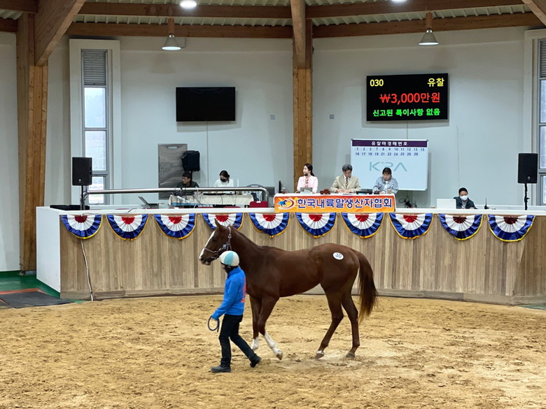 한편 이날 최고가인 6천만 원을 기록한 낙찰마는 총 4마리로, 각각 ‘한센’, ‘커널존’, ‘지롤라모’, ‘포리스트캠프’라는 씨수말의 자마다. 이 중 세계에서 가장 비싼 씨수말 중 하나인 ‘태핏(Tapit)’의 자마 ‘한센’은 2023년 4월 현재 기준 국내 씨수말 순위 1위를 기록하고 있을 정도로 능력이 검증된 씨수말이다.