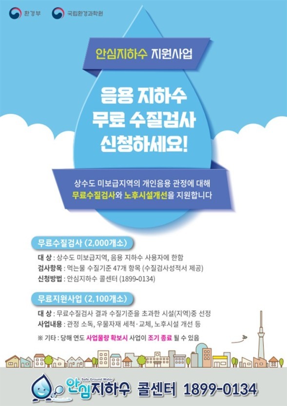 무료 수질검사를 희망하는 주민은 국립환경과학원(환경부 산하)에서 운영하는 ‘안심지하수 콜센터(☎1899-0134)’를 통해 신청할 수 있다.