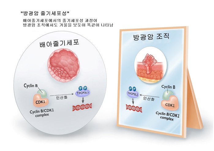 울산의대 의생명과학교실 신동명 교수와 서울아산병원 병리과 조영미 교수 연구팀은 줄기세포의 특정 단백질인 CDK1과 TFCP2L1의 이상이 방광암으로 발전하는 ‘방광암 줄기세포성’을 일으키는 기전을 최초로 규명해냈다.