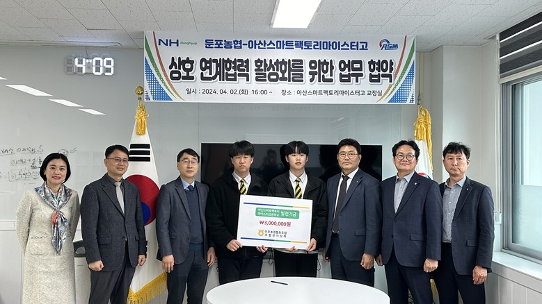 협약에 따라 둔포농업협동조합은 아산스마트팩토리마이스터고등학교 학생들에게 매년 300만원씩 장학금으로 지급하게 된다.
