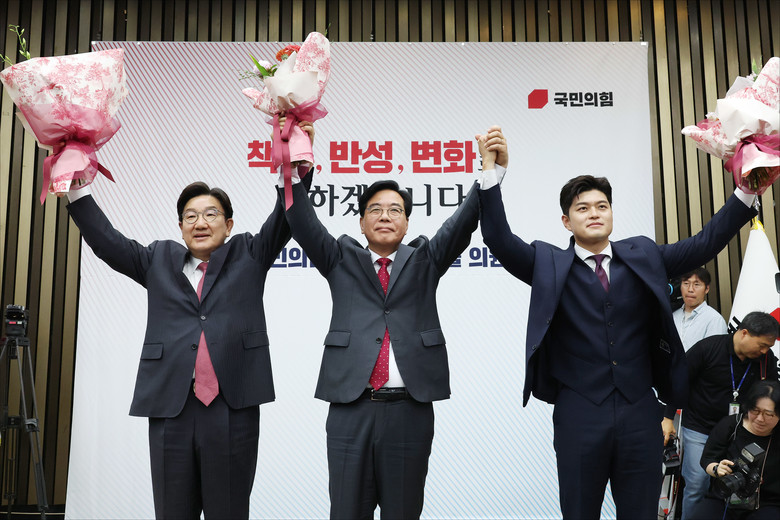 국민의힘 신임 원내대표로 당선된 송언석 의원이 16일 원내대표 선출 의원총회가 열린 국회 회의장에서 권성동 전 원내대표, 김용태 비상대책위원장과 기념촬영을 하고 있다. 2025.6.16 [공동취재]