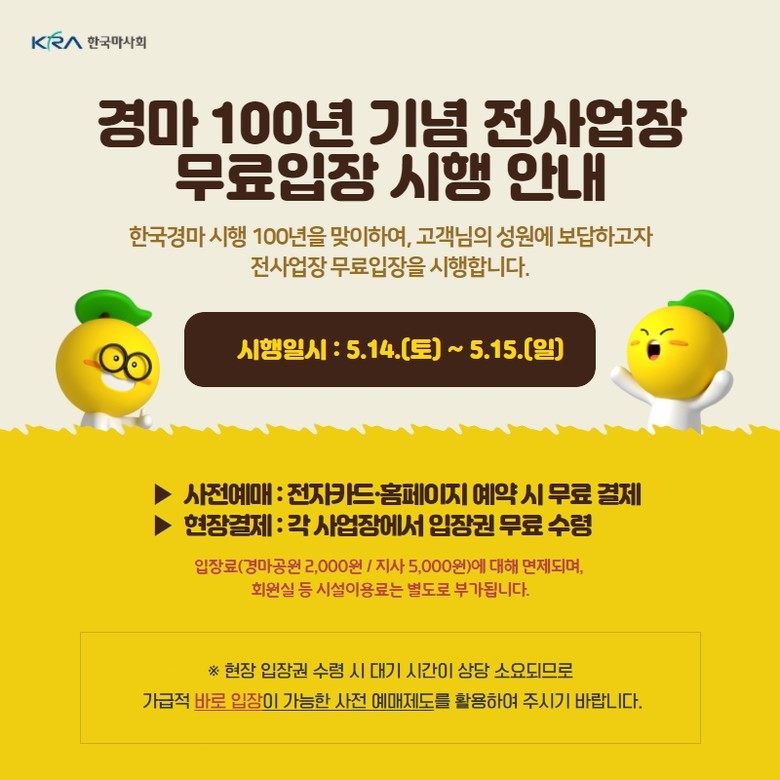 사전예매 고객의 경우 전자카드나 홈페이지 예약 시 무료로 결제가 진행되며 현장결제 고객은 각 사업장에서 입장권을 무료로 수령하는 방식이다. 경마공원의 경우 2,000원, 지사의 경우 5,000원의 입장료가 면제되며 회원실 등 시설 이용료는 별도로 부가된다.
