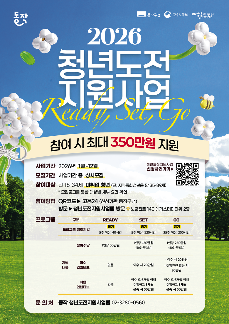 - 프로그램 참여 기간 및 구직활동에 따라 1인당 최소 50만 원에서 최대 350만 원까지 지원 [동작구 세계타임즈=이장성 기자] 동작구(구청장 박일하)가 고용노동부 주관 공모사업인 '2026년 청년도전 지원사업'에 선정돼 참여자를 모집한다고 밝혔다.