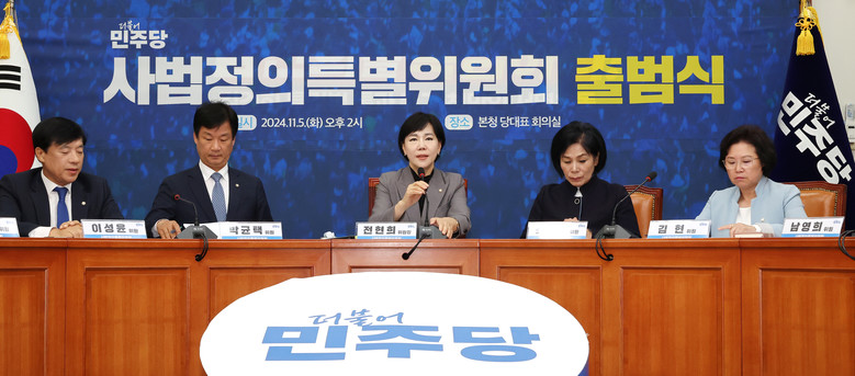 5일 오후 국회에서 열린 더불어민주당 사법정의특별위원회 출범식에서 전현희 위원장(가운데)이 발언하고 있다. 2024.11.5