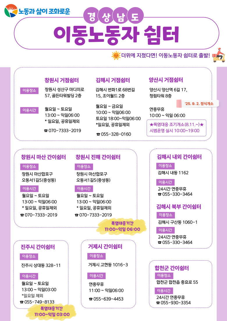 폭염대응기간 운영 시간이 앞당겨진 간이쉼터는 △창원시 마산 이동노동자 쉼터 △창원시 진해 이동노동자 쉼터 △진주시 이동노동자 쉼터 3곳이다. 창원 쉼터는 오전 11시에서 다음 날 오전 6시까지, 진주 쉼터는 다음 날 오전 3시까지 이용할 수 있다.
