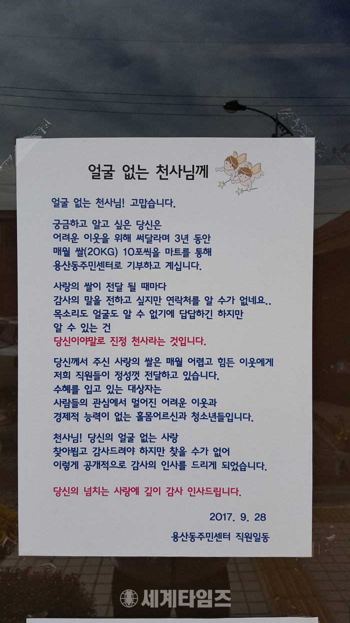 이에 주민센터에서는 최근 얼굴 없는 기부천사에게 전하는 감사의 인사말을 주민센터 출입구 정문에 게시했다.