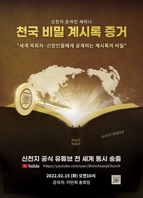신천지예수교 증거장막성전(신천지예수교회) 이만희 총회장이 오는 15일 전 세계 동시 송출되는 유튜브로 계시록 특강에 나선다.
