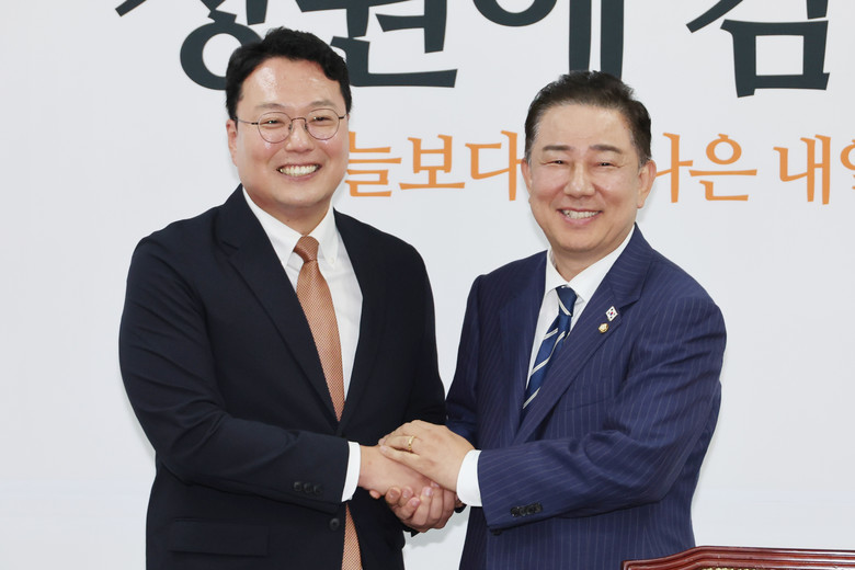 [세계타임즈 = 신상철 기자] 더불어민주당 김병기 당대표 직무대행 겸 원내대표(오른쪽)가 18일 서울 여의도 국회에서 개혁신당을 예방해 천하람 원내대표와 악수하고 있다. 2025.6.18