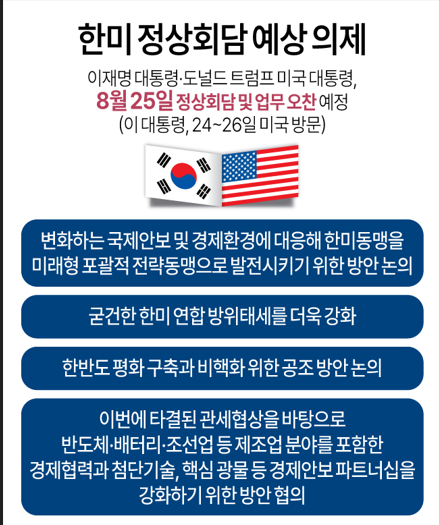 강 대변인은 이번 정상회담이 25일로 정해진 배경에 대해 "트럼프 대통령이 앞서 관세협상을 타결하며 '2주 이내 정상회담'을 언급했지만, 그 당시에도 정확하게 시한을 정한 것으로 보기는 어려웠다"며 "양국 정상의 일정이 빠듯한 상황에서 실무조정을 거쳐 정해진 날짜"라고 설명했다.한미 정상은 지난 6월 17일(현지시간) 캐나다 주요7개국(G7) 정상회의 참석을 계기로 정상회담을 하기로 했으나, 당시 트럼프 대통령이 중동정세 악화를 이유로 급거 귀국하며 회담이 불발된 바 있다.
