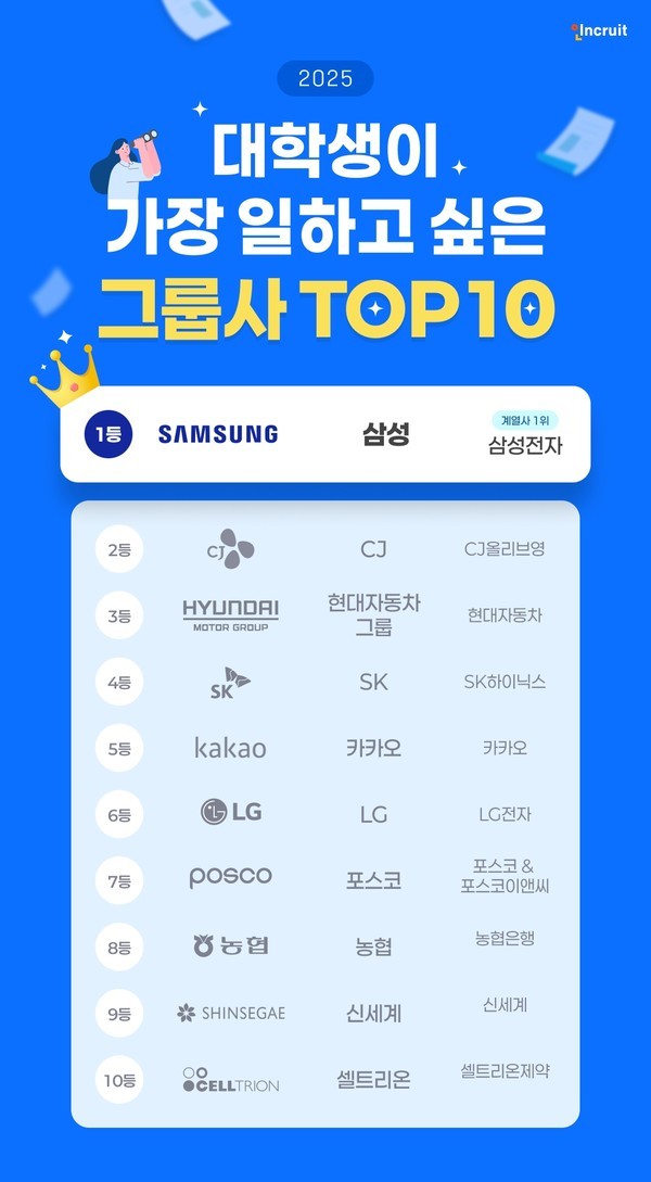 계열사로 보면 삼성에서는 삼성전자가 58.9%로 1위를 차지했으며, CJ는 CJ올리브영(41.8%)이 가장 높은 지지를 얻었다. 현대차는 현대차(78.4%), SK는 SK하이닉스(62.7%)가 대학생들로부터 가장 많은 선택을 받았다.