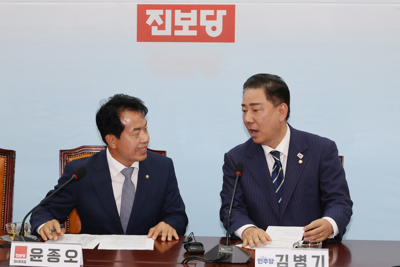 [세계타임즈 = 신상철 기자] 더불어민주당 김병기 당대표 직무대행 겸 원내대표(오른쪽)가 18일 서울 여의도 국회에서 진보당을 예방해 윤종오 원내대표와 대화하고 있다. 2025.6.18