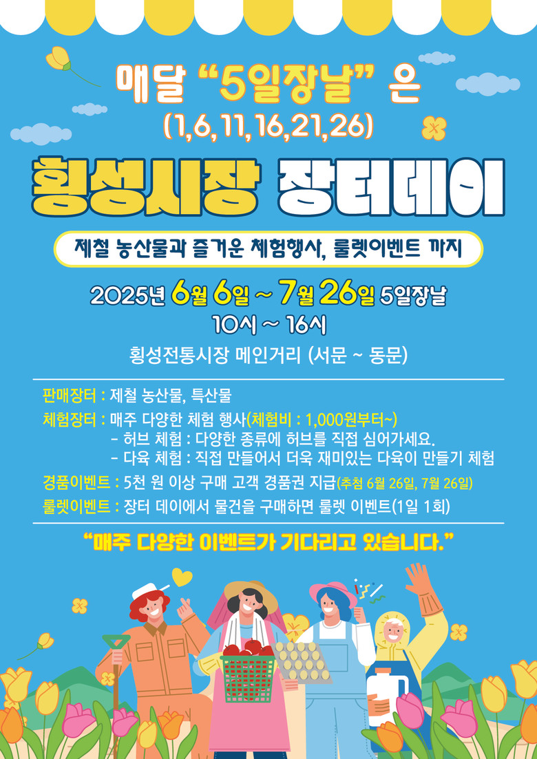 (사)횡성시장조합이 주관하는 장터데이는 5일장이 열리는 날마다 횡성전통시장 동문~서문 구간에서 방문객들에게 체험 프로그램과 이벤트를 선보일 예정이다.