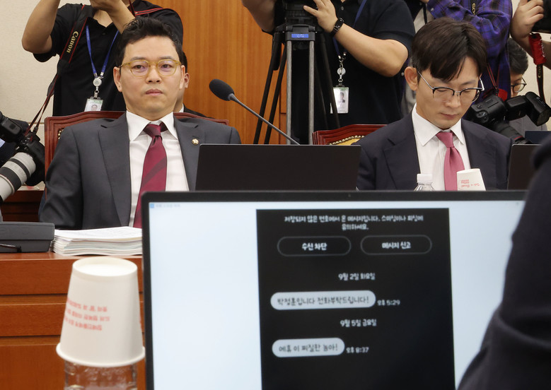 국민의힘 박정훈 의원이 16일 국회 과학기술정보방송통신위원회에서 열린 2025년도 국정감사에서 더불어민주당 김우영 의원이 공개한 자신의 휴대전화 문자를 바라보고 있다. 2025.10.16